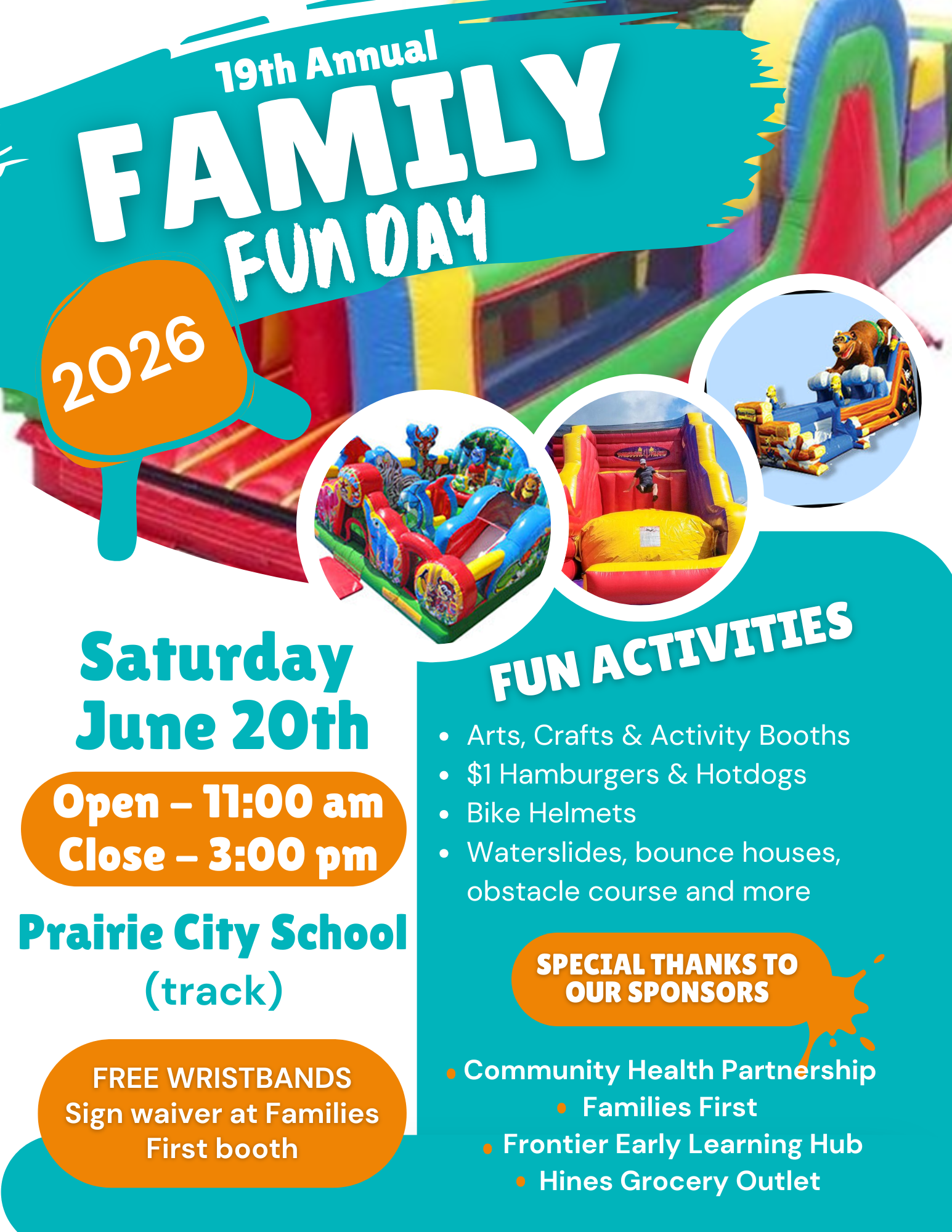 June 20 11:00 AM – 3:00 PM at Prairie City School This annual family friendly event offers affordable fun for the whole family! Hamburgers and Hot Dogs are $1 and wrist bands are free this year! Giant inflatables and booths with activities for children make this a family friendly fun event! Need transportation? Call 541-5751006 … Read more